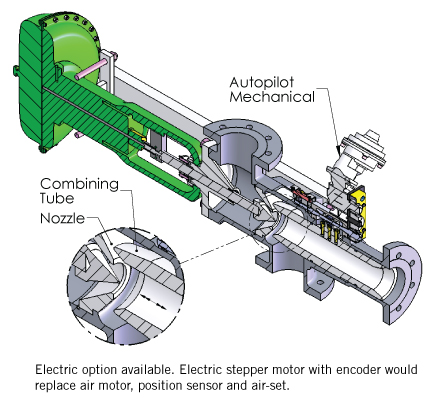 To change the flow path, the air motor and gear assembly, adjust the CTA driveshaft position; this moves the combining tube linearly, thereby adjusting the combining tube to nozzle gap. As the combining tube/nozzle gap is widened, the pressure drop is lowered. As the gap is narrowed or closed, the pressure drop is increased. The pressure drop is measured between the inlet and the discharge of the slurry connections on the Hydroheater.